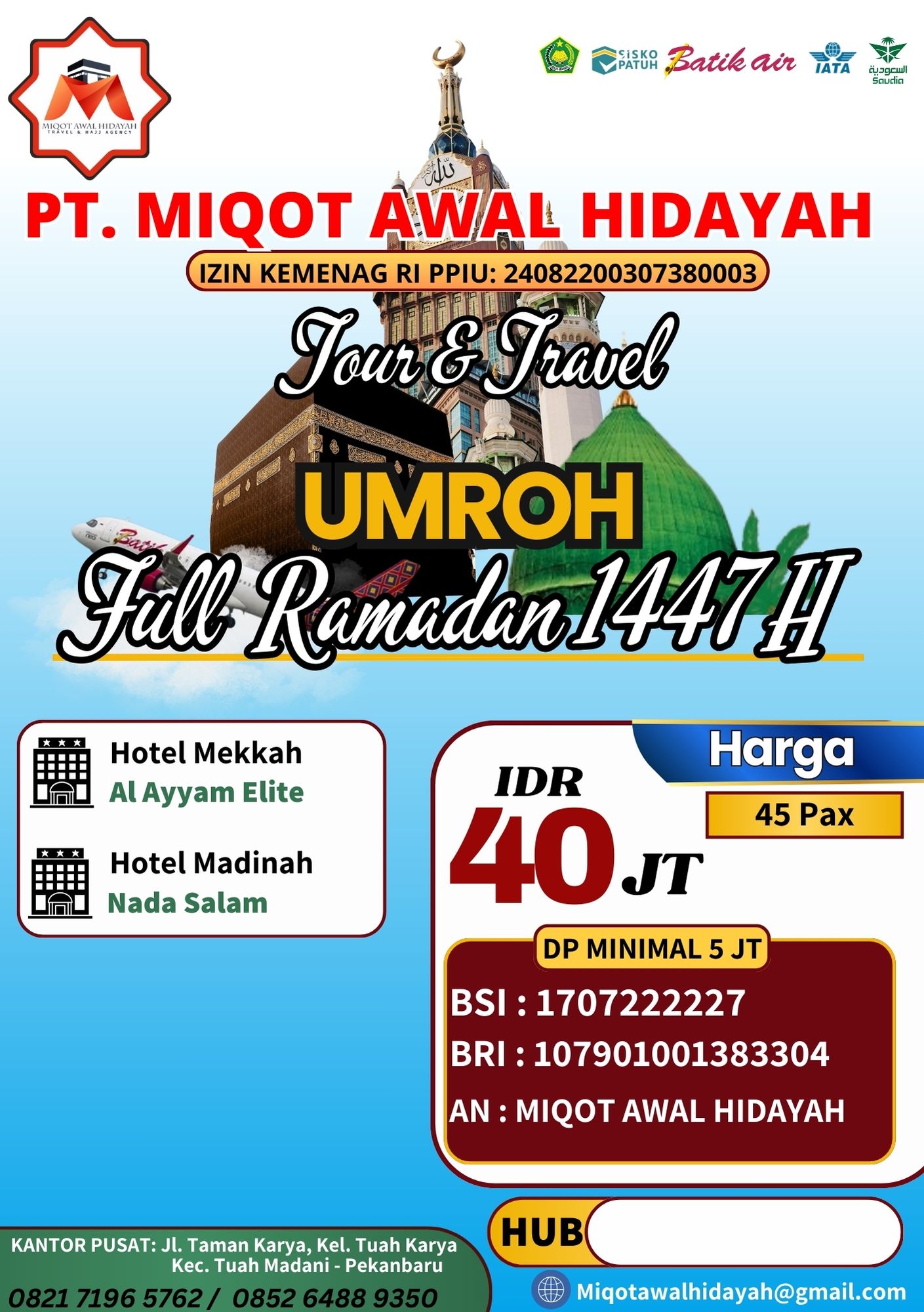 Sudah termasuk tiket pesawat PP, akomodasi hotel, konsumsi, dan bimbingan ibadah selama Ramadhan.